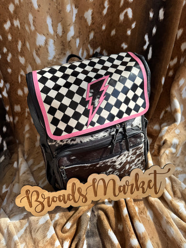 Pink Lightening Bolt Checkered Cowhide Backpack