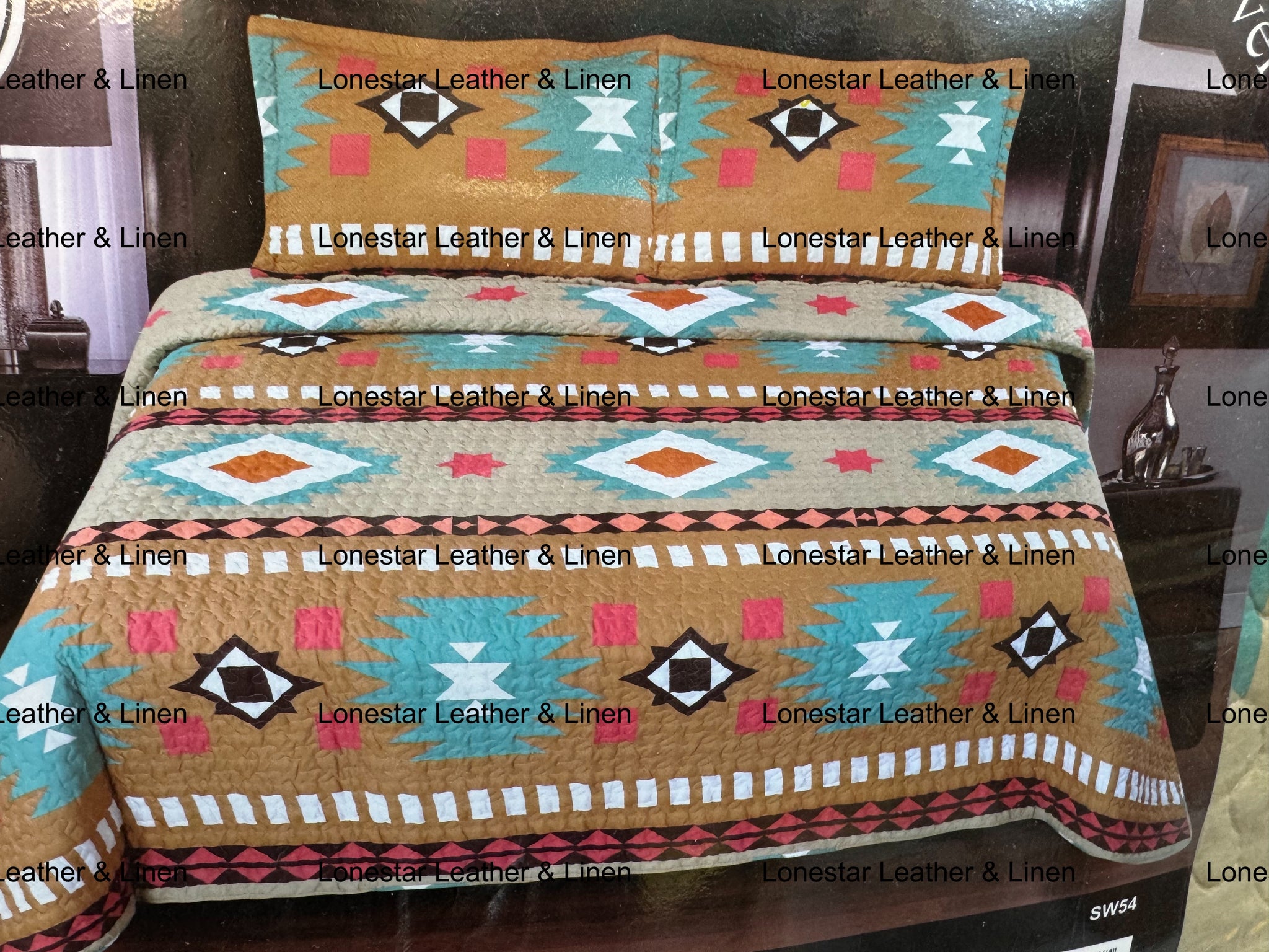 The Beige Aztec 3 Piece Bedding Set features a durable microfiber construction, ensuring both comfort and longevity. This set includes two shams and one comforter, providing complete bedding coverage. The fabric's inherent softness contributes to enhanced sleep quality, making it a practical choice for any bedroom environment.