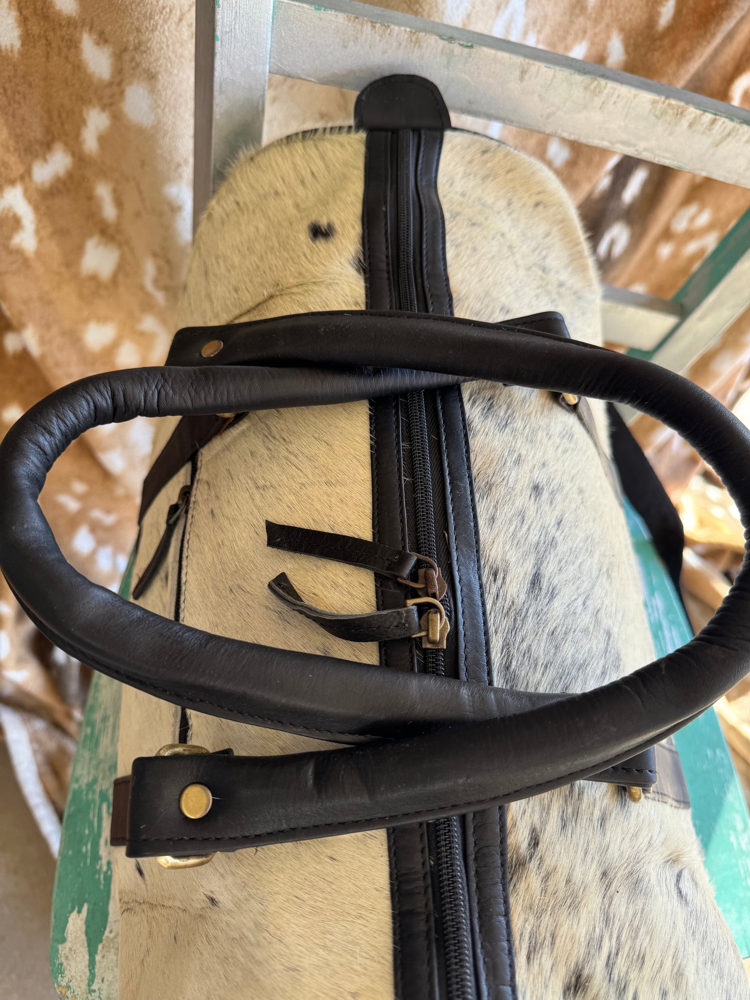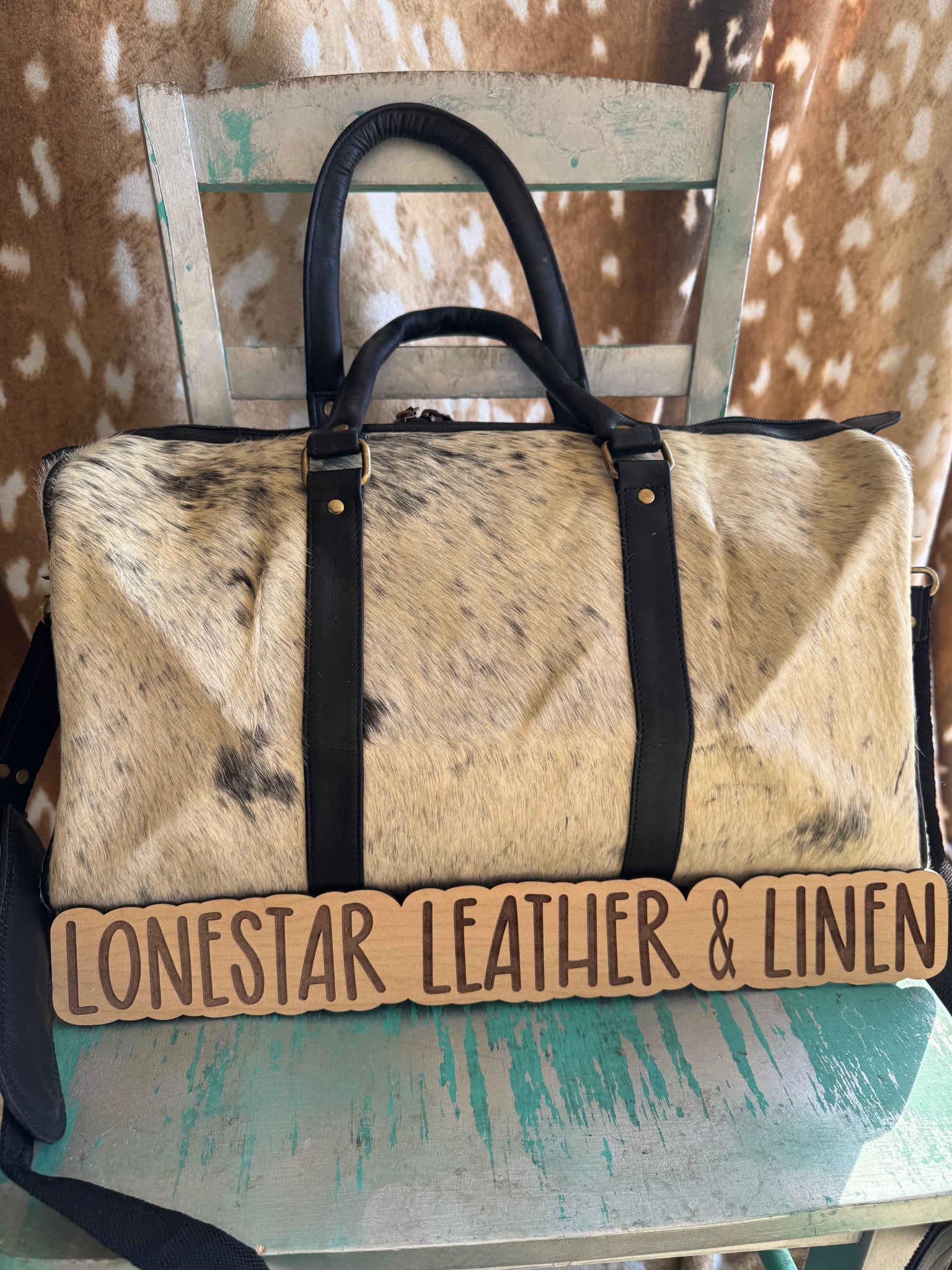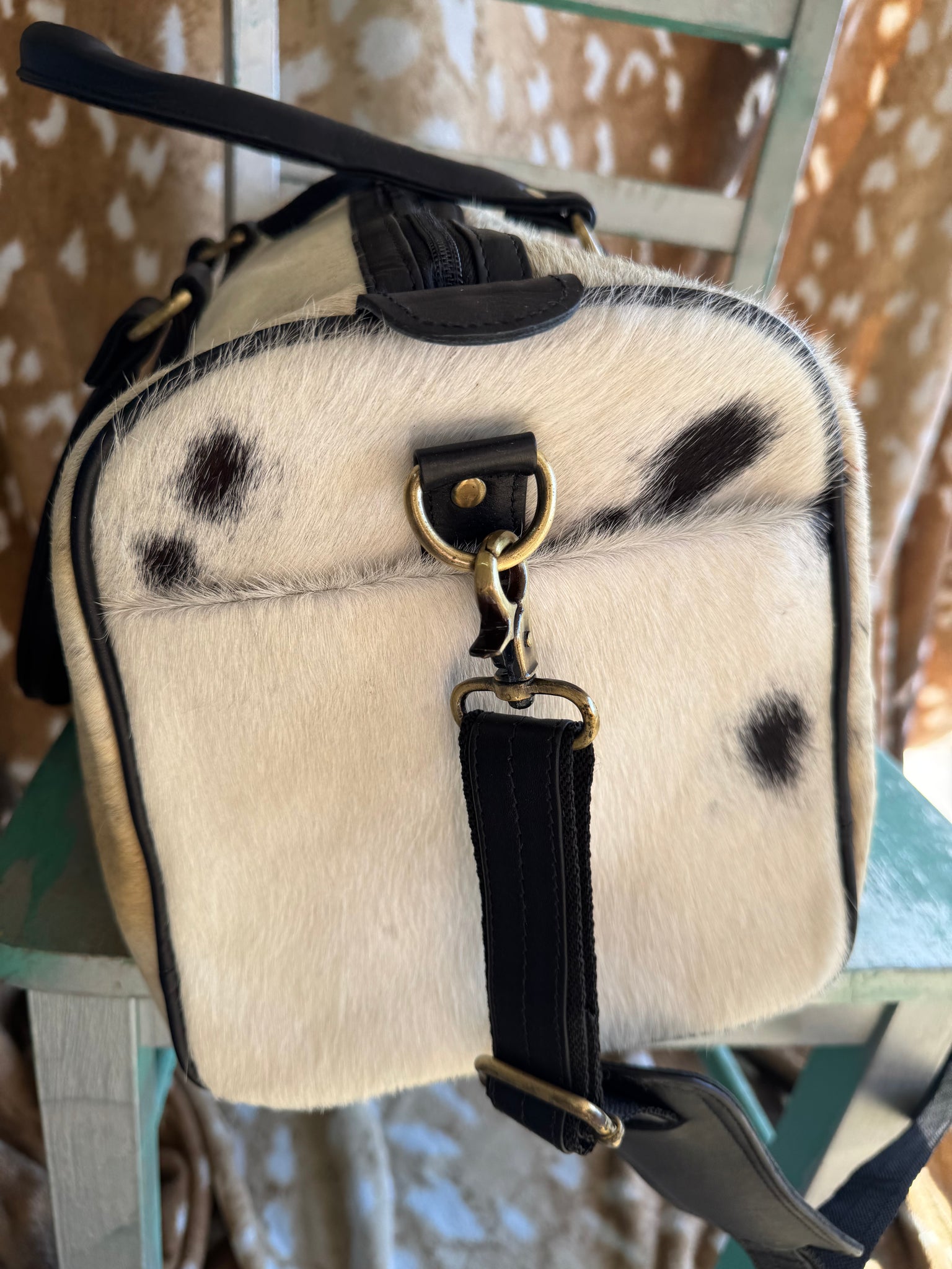 The Cowhide Duffle Overnight Bag is constructed from authentic cowhide, ensuring durability and a classic aesthetic. With dimensions of 17x11x9 inches, it offers ample space for overnight essentials. The removable crossbody strap provides versatile carrying options, enhancing convenience during travel.