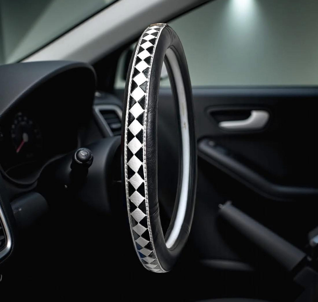 Upgrade your car's interior with our Checkered & Turquoise Steering Wheel Cover. Made of authentic leather, it adds a touch of style while providing a comfortable grip. Improve your driving experience with its 15" diameter and enjoy a secure and luxurious ride. Stitching and diamond color vary- please email if you would like white or black diamond.