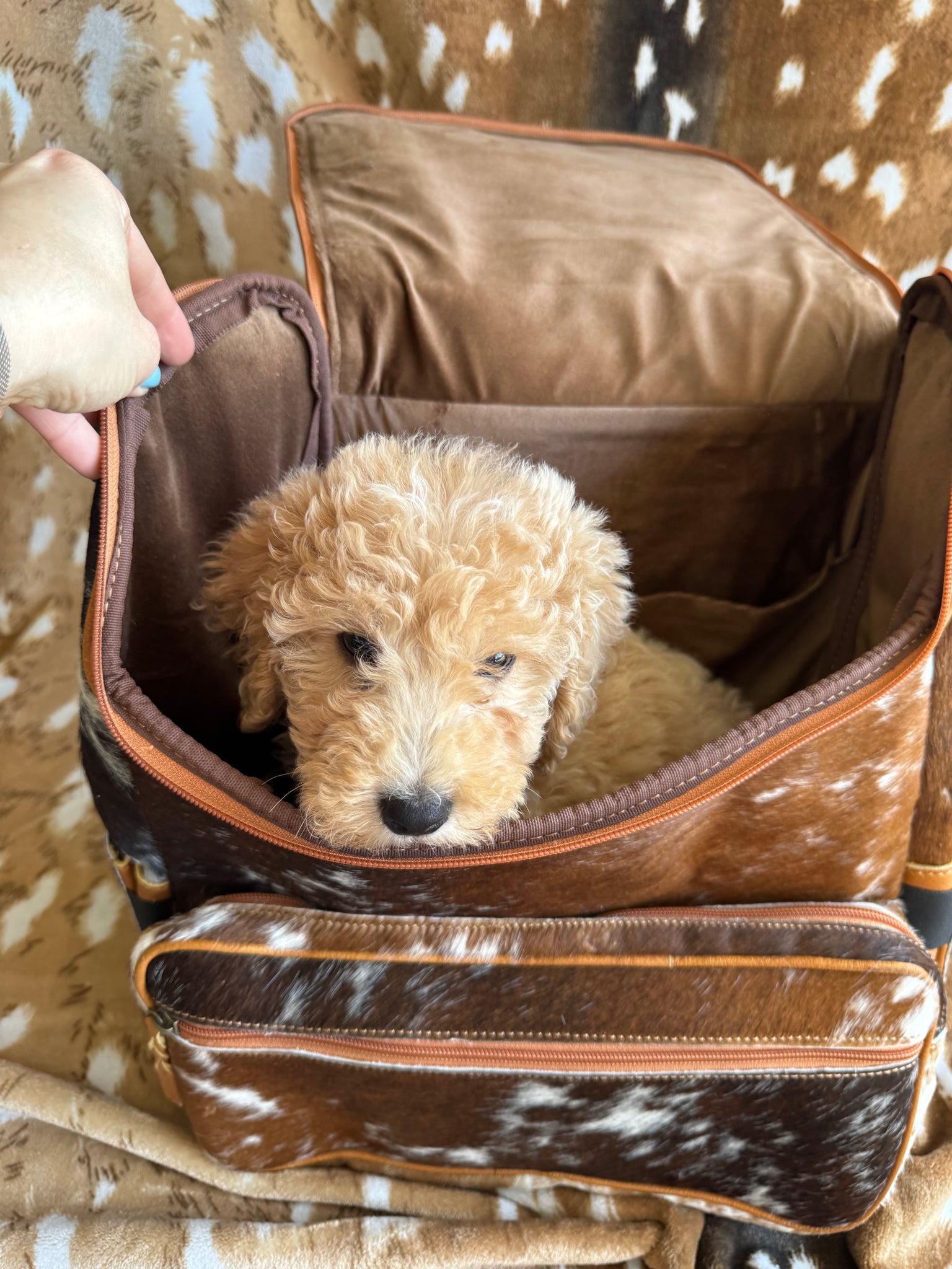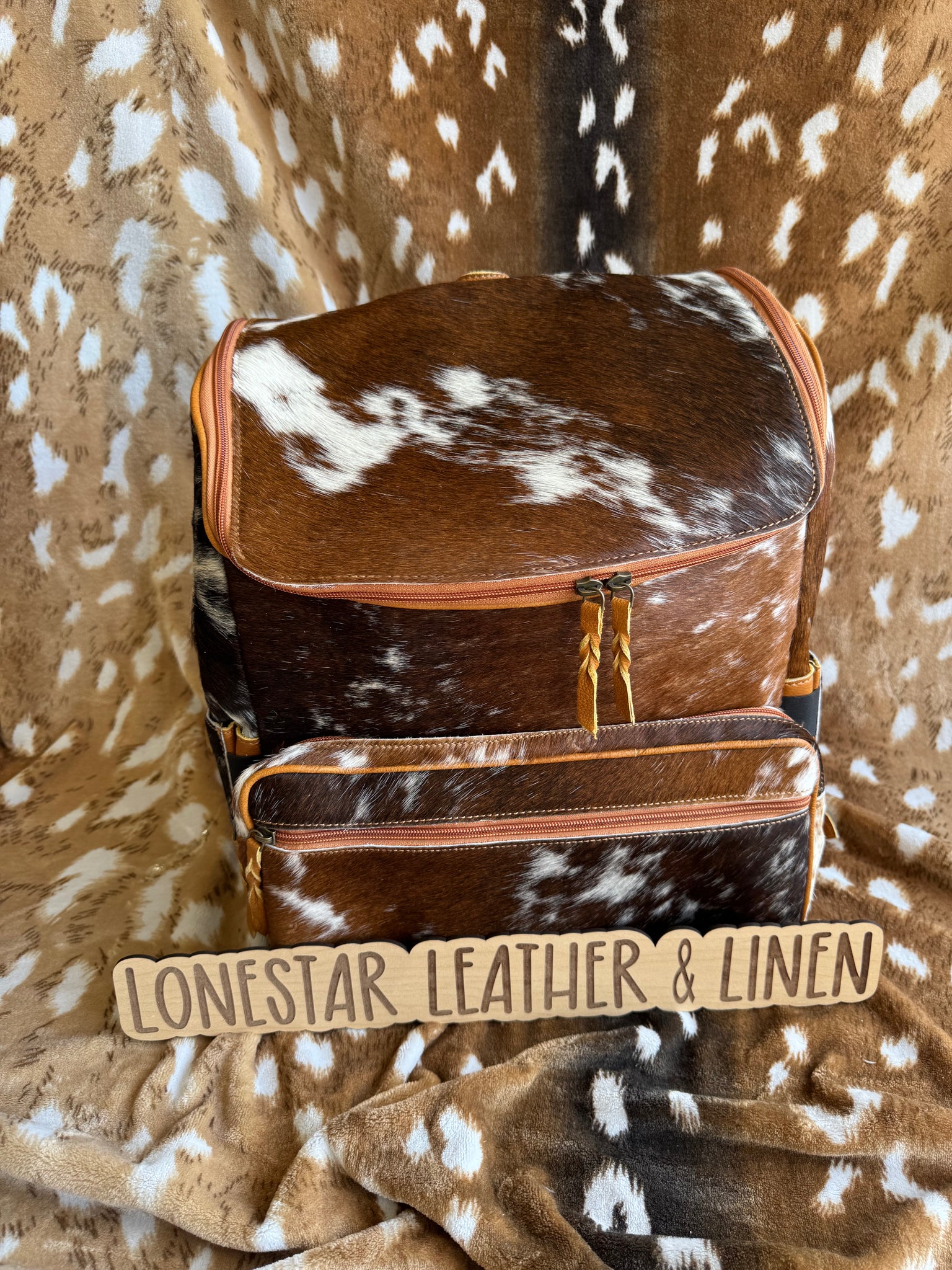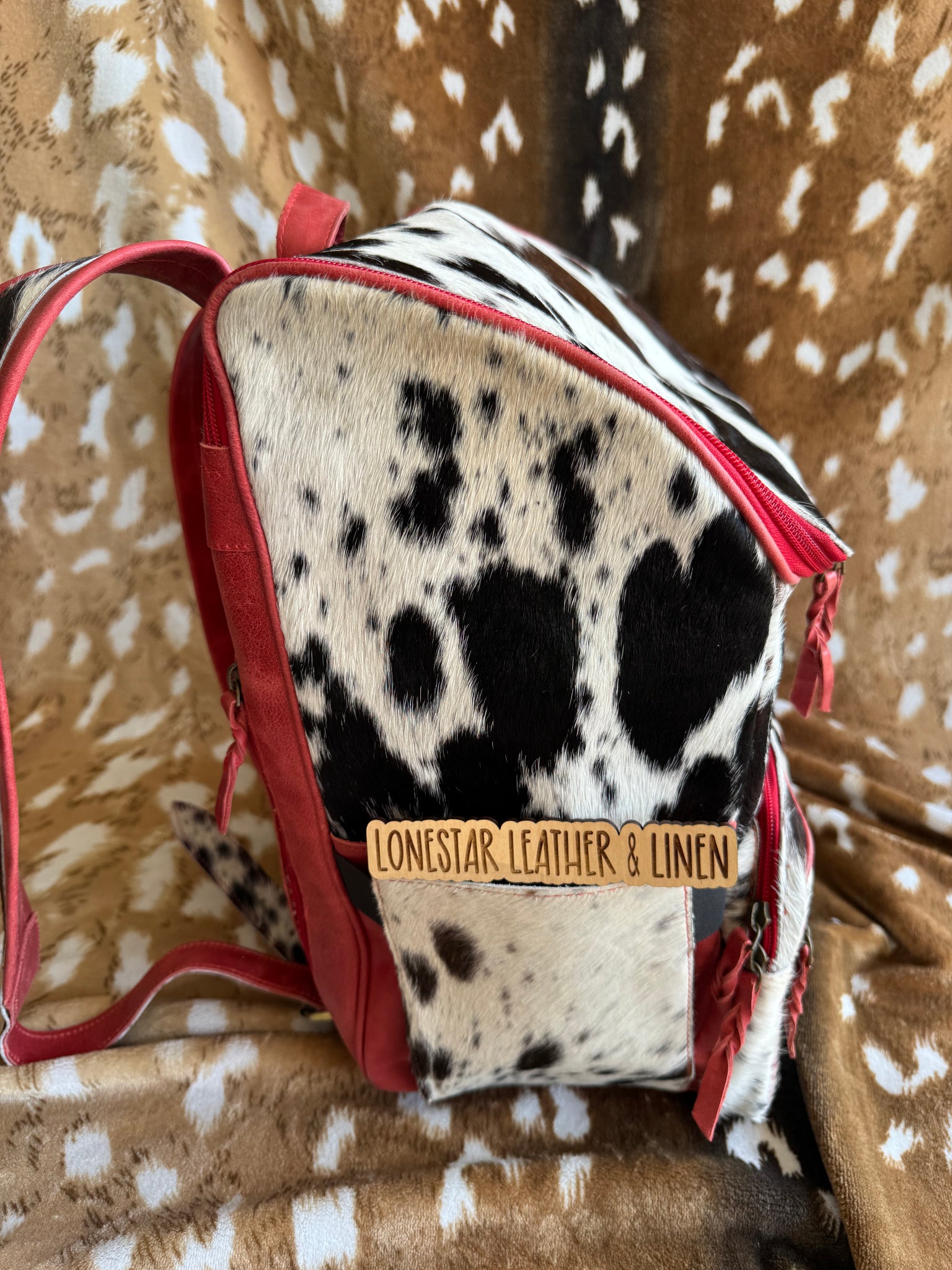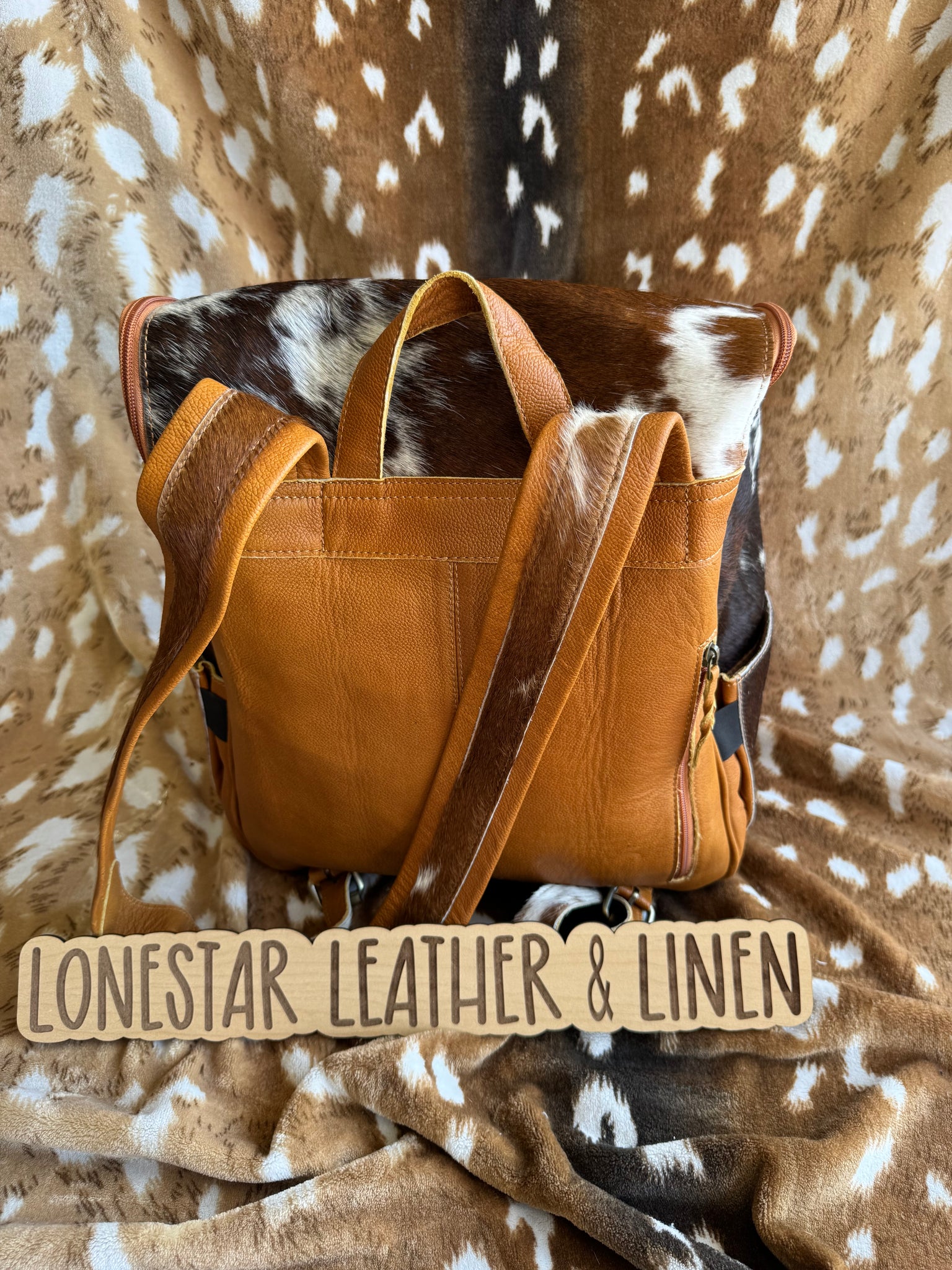 The Cowhide & Leather Jess Backpacks are crafted from authentic cowhide and leather, ensuring durability and a unique aesthetic. With dimensions of 16.5 x 10 x 14 inches, they offer ample storage space while maintaining a lightweight profile, suitable for everyday use. Crushes velvet interior with laptop pocket. Exact cowhide varies.