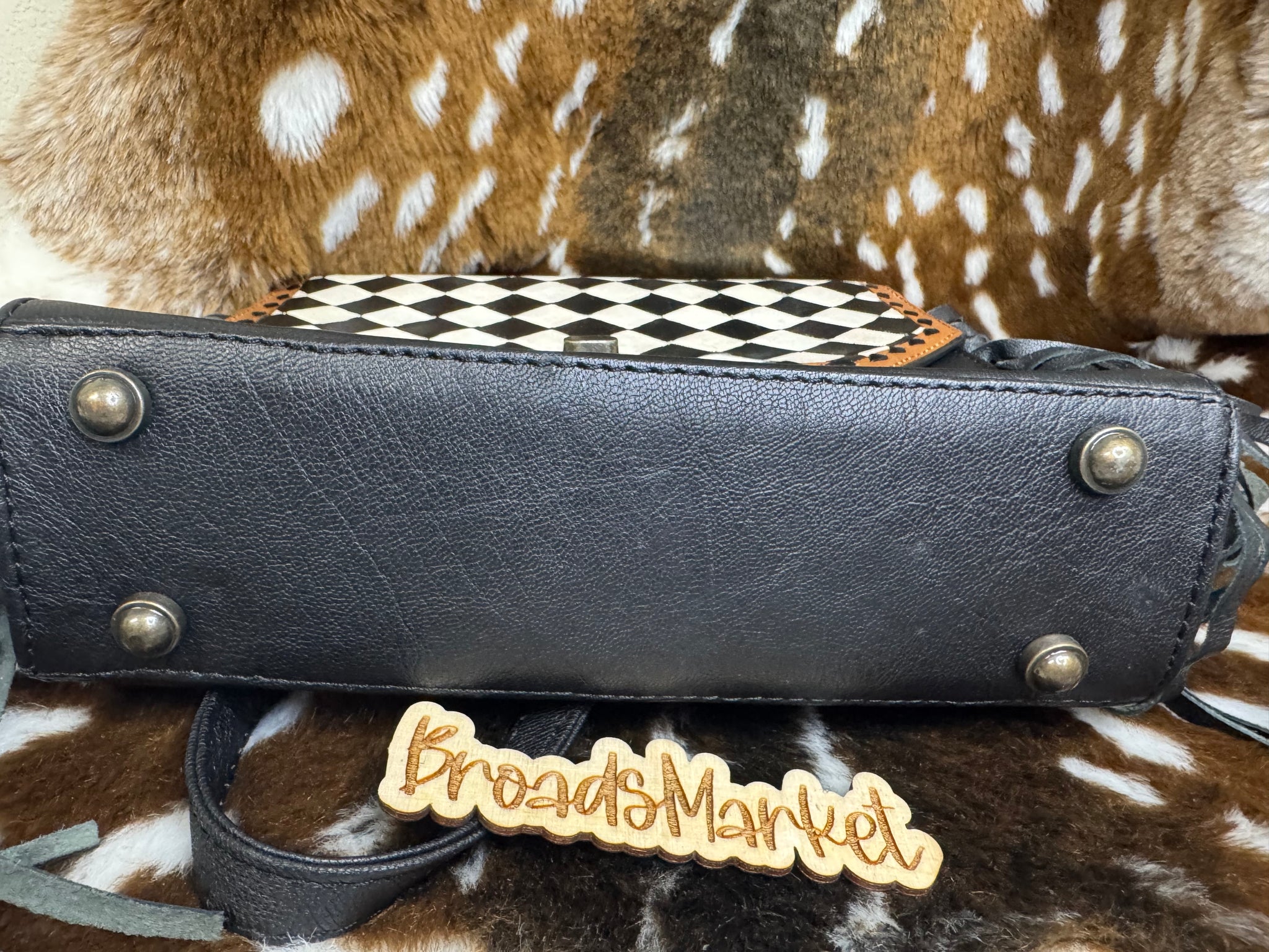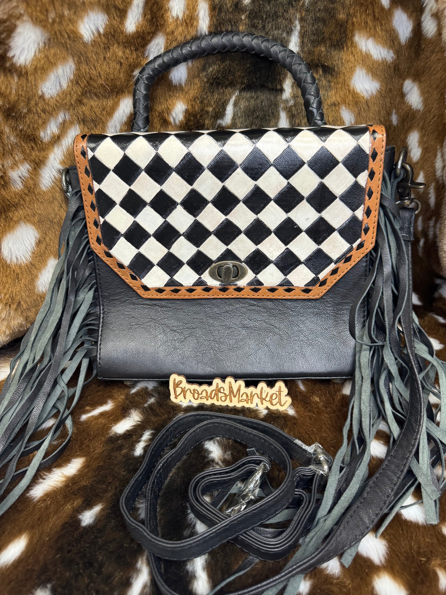 This Melanie Handle Crossbody Fringe Purse combines authentic leather with hand painted details. With a removable crossbody strap and a 10x9x4" size, it offers both style and functionality. Expertly crafted and versatile, this purse is the perfect addition to any wardrobe.