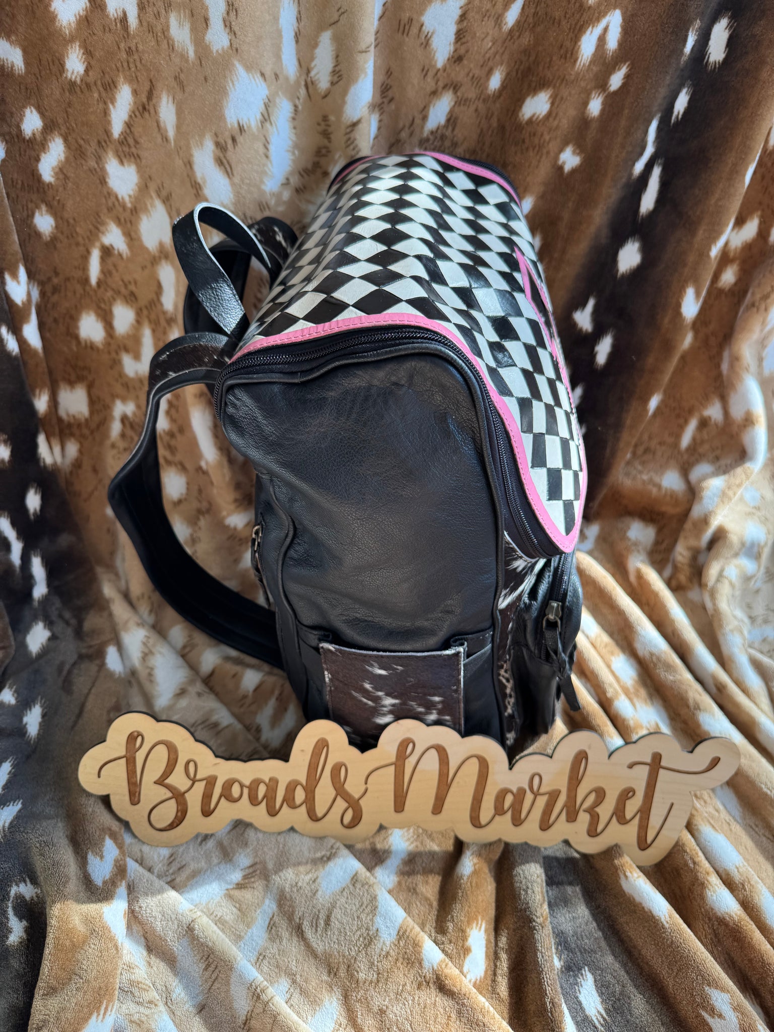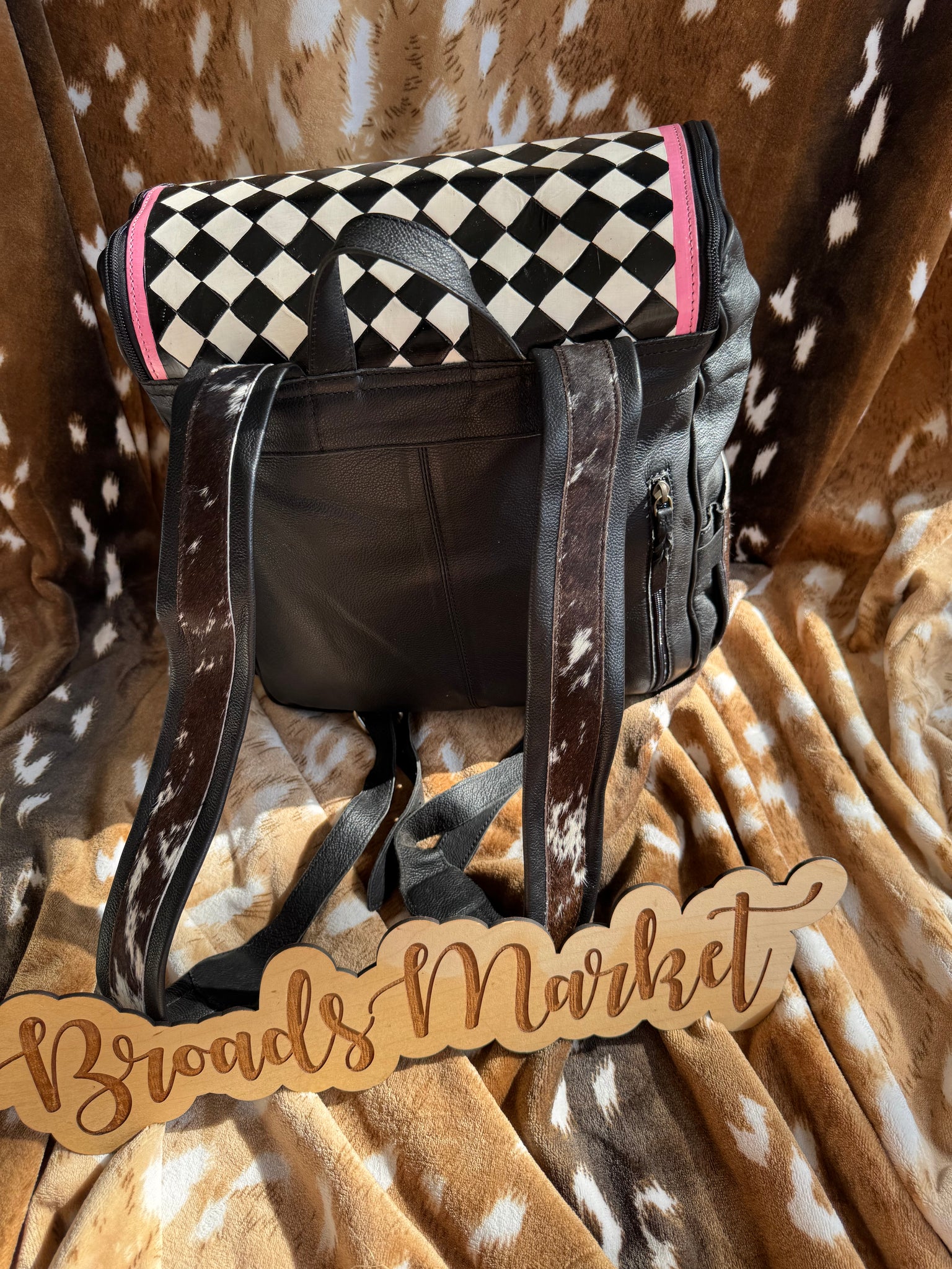 Expertly crafted from authentic Columbian cowhide, this backpack boasts a unique hand-painted pink lightning bolt checkered design. The durable leather ensures long-lasting quality, while the spacious 15x9.5x14" size provides ample room for all your essentials. Elevate your style with this one-of-a-kind cowhide backpack.