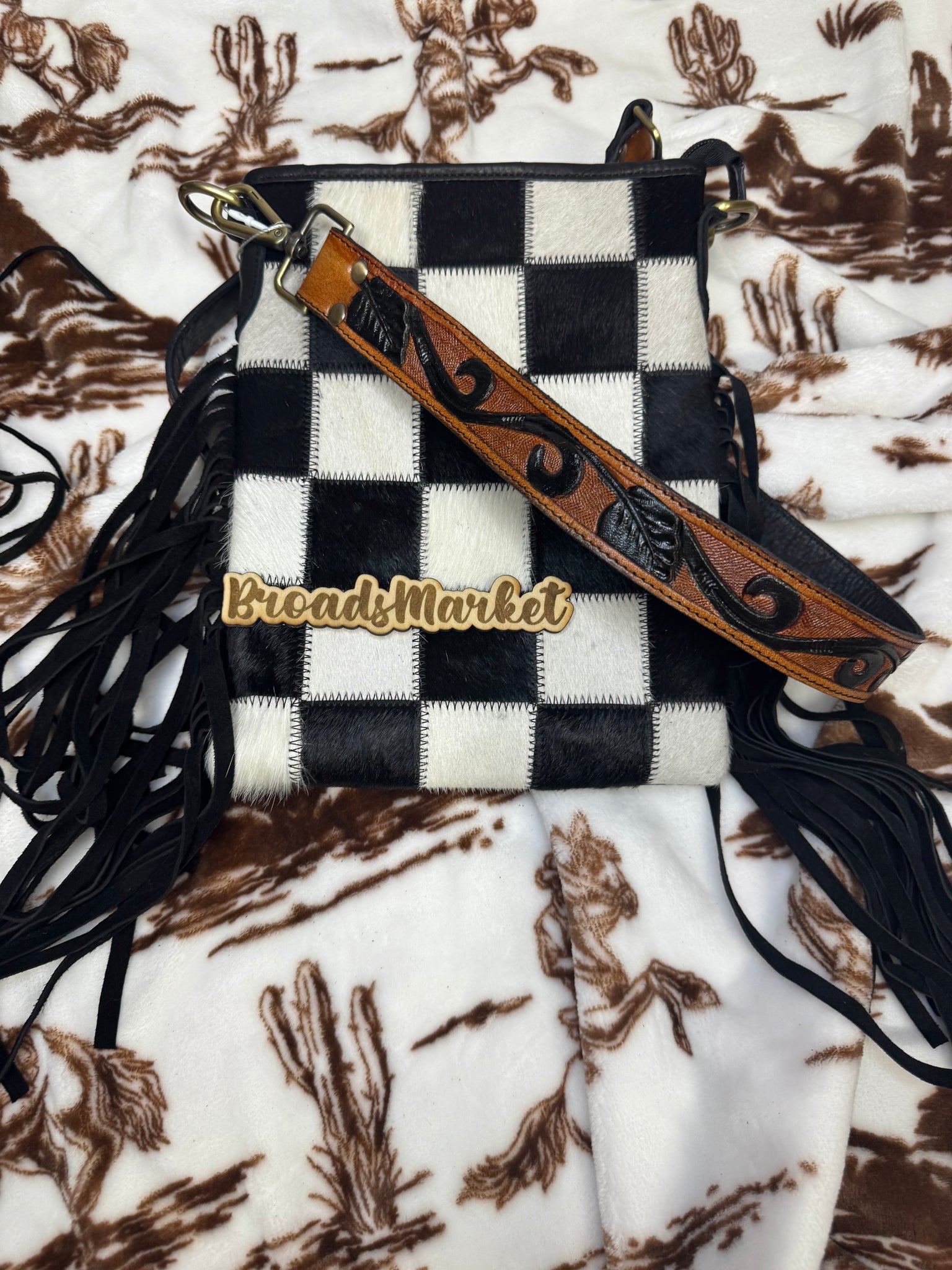 Expertly crafted with authentic cowhide, the Sabina Black Checkered Cowhide Crossbody Purse is a versatile and stylish accessory for any occasion. The removable crossbody strap adds convenience, while the 10x7.5" size makes it the perfect size for your essentials on the go. Perfect for the fashion-forward and practical individual.