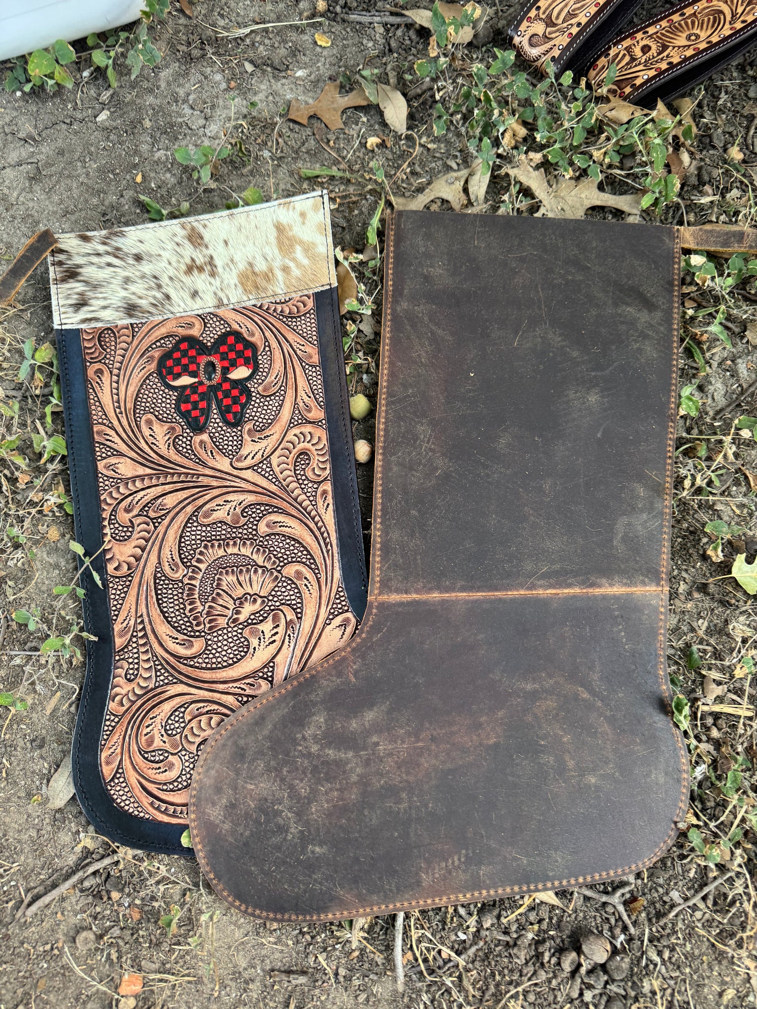 Expertly crafted with authentic hand tooled leather, each cowhide varies in exact pattern and color, making each stocking truly unique. Hand painted with precision, the red checkered bow adds a festive touch to this beautiful 17x11" stocking. Elevate your holiday decor with this one-of-a-kind piece.