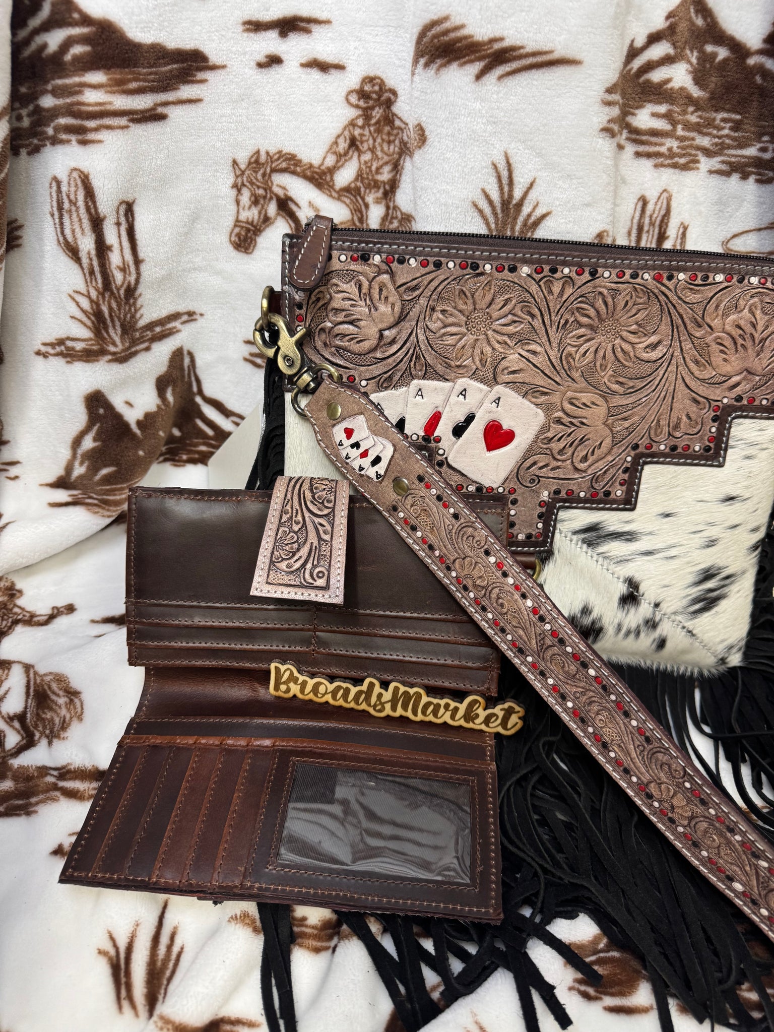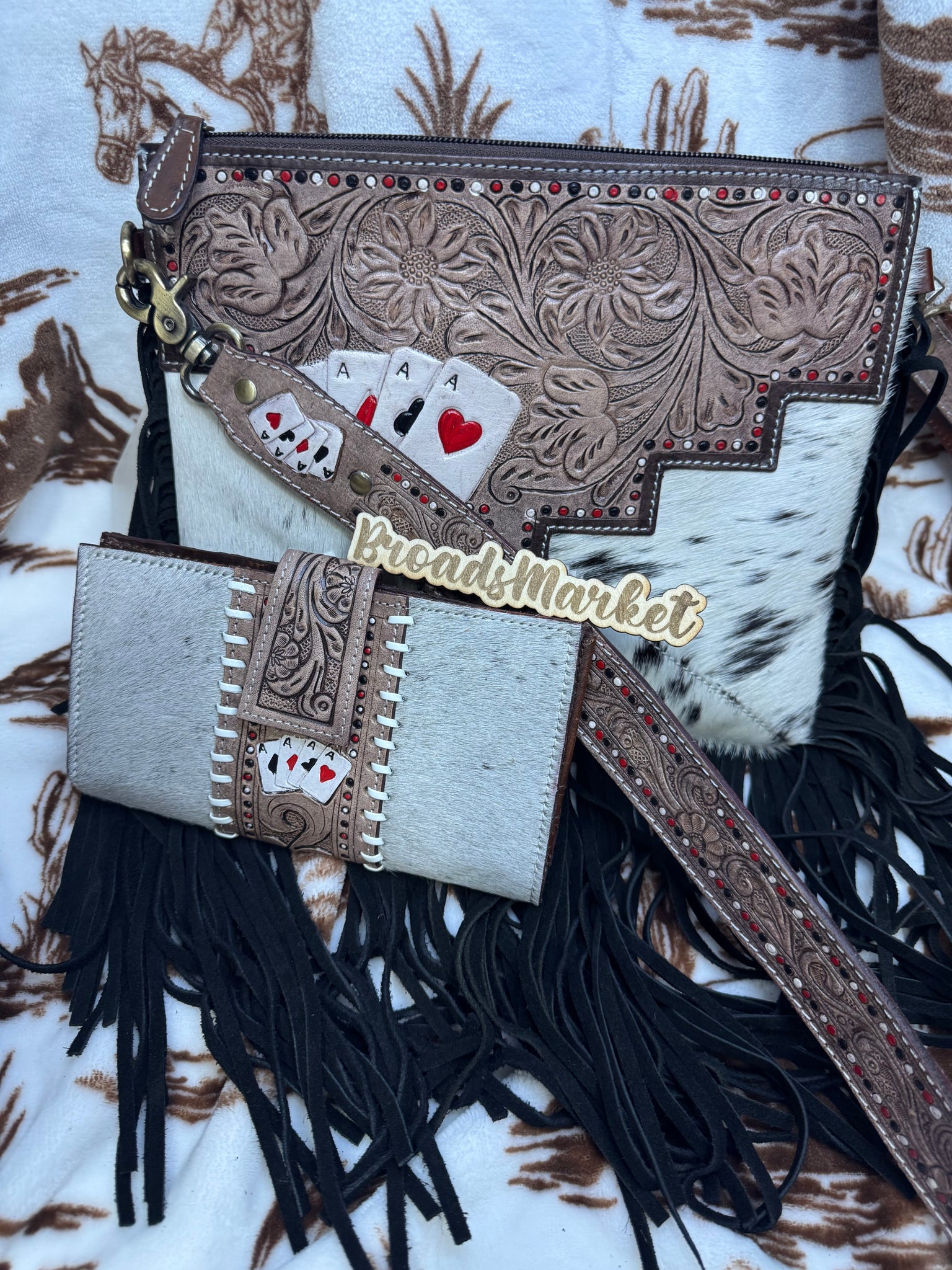 This Vegas Cowboy Purse & Wallet Set is crafted from authentic cowhide and leather, providing durability and a touch of luxury. The removable crossbody strap adds versatility, perfect for any occasion. The set includes a spacious purse measuring 10.5x9", making it the ideal choice for all your essentials.